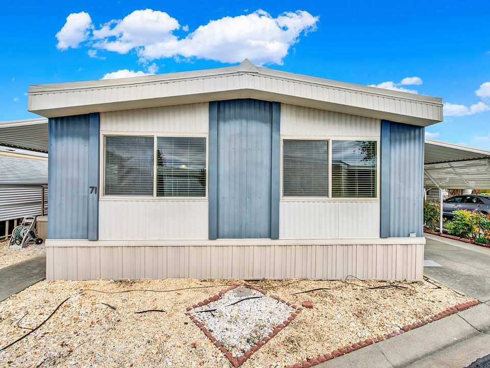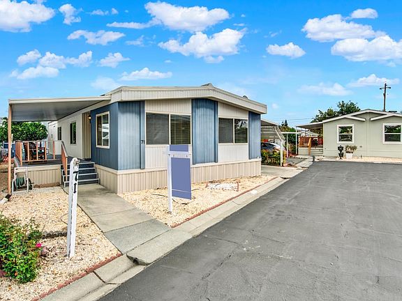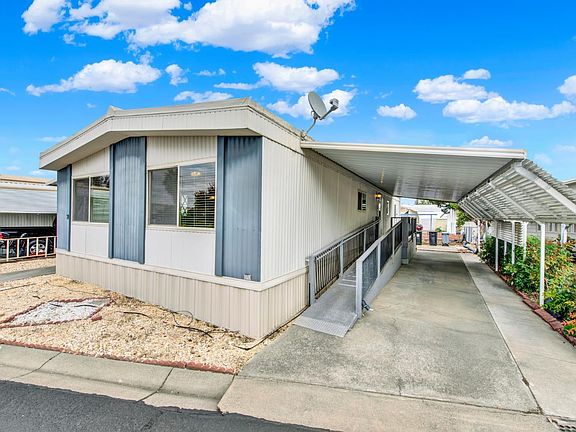 Nestled within the highly sought after Lemon Tree 55+ community you'll find this spacious double wide. It has an open concept layout with an abundance of natural light. There's newly installed carpet and flooring throughout with a large family room and dining area accompanied by a kitchen that has a never used stove with lots of storage and cabinet space. There are 2 bedrooms and 2 bathrooms. The primary bedroom is ample sized with 2 closets and the second bedroom is just as nice and could be used for guests or as a home office. All the rooms are generous in size. Additional highlights include the indoor laundry area, and covered carport. Some accessible features include a built in ramp for your convenience and grab bars in the primary bathroom. Outside you can relax and enjoy the covered front porch. Nut Tree shopping and the Vacaville outlets are nearby plus a variety of restaurants and activities. The community amenities include a clubhouse with a kitchen, swimming pool, bocce ball courts and more. Washer, dryer and refrigerator convey with the property. THIS HOME IS MOVE IN READY AND TRULY A MUST SEE!