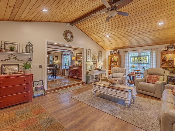 Step inside to a breathtaking family room featuring a soaring cathedral tongue-and-groove ceiling and beautiful engineered hardwood floors. Host memorable dinners in the generous dining room or whip up meals in the delightful country kitchen. The flexible layout includes a third bedroom that's also being used as a luxurious walk-in closet. The tranquil primary suite offers a spa-inspired bathroom complete with a soothing whirlpool tub, separate walk-in shower, and charming tin ceiling. A second full tiled bathroom provides convenience for guests.