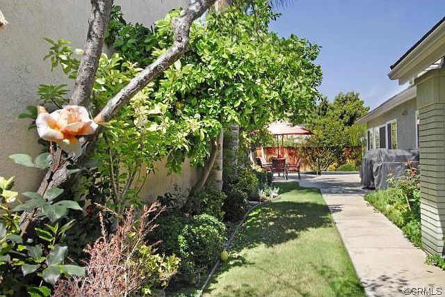 This stunning single story residence is truly an Entertainers Dream. As you enter through the black wrought iron gate, you will enjoy a lovely wrap around garden with tropical landscaping, fruit trees, beautiful patio area, private pool and spa. The pool has a PebbleTec cobalt blue floor. The interior features a separate living room, formal dining room, remodeled kitchen, spacious family room, 4 bedrooms and 2 baths. The main living areas all have been enhanced with stylish distressed hardwood floors. The kitchen has been totally remodeled with granite counters, a Viking 6 burner gas cook top, double wall ovens, a stainless steel side-by-side refrigerator and a built-in wine cooler. The adjacent family room has a stacked stone fireplace and lots of windows with plantation shutters. The spacious master suite looks out to the pool and garden and features a gorgeous bathroom with dual sinks, a large closet with organizers and a wonderful shower area with tumbled stone features. Custom