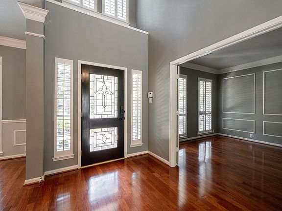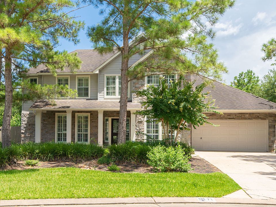 Fantastic 4 bedroom, 4.5 bathroom, 2-story home with a 2-car attached garage, pool, spa, and an excellent curb appeal with a shaded front porch! Inside, you'll find beautiful hardwoods throughout the first floor, tile in the wet areas, high ceilings, plantation shutters, crown molding, and updated paint. There's a formal dining, a French door study with a private bath, a nice utility room, and a spacious living room with a fireplace and built-ins. The kitchen features a bay window breakfast area, island with electric cooktop, ample cabinet space, solid surface countertops, recessed lighting, and a tile backsplash while the large master suite downstairs boasts a sitting area, dual sinks, a whirlpool tub, separate shower, and dual closets. Upstairs holds the secondary bedrooms, two full baths, and a game room. Enjoy the huge backyard space which also includes a firepit. This home is located on a large cul-de-sac lot with easy access to major roads and tons of shopping, dining, and entertainment in the Woodlands area!