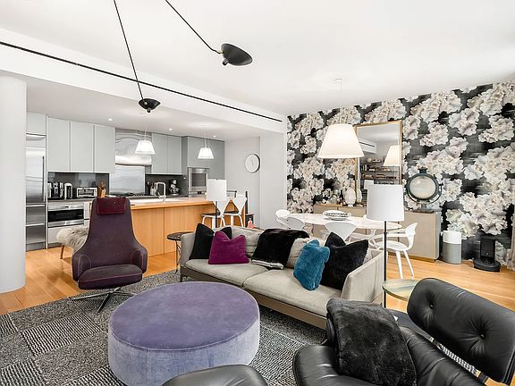 This chic, sprawling space is open and ethereal. Resplendent in natural light from northern and southern exposures. An entertainer's dream kitchen by Eggersmann is equipped with an eat-in waterfall island and a suite of fully-integrated Gaggenau appliances.