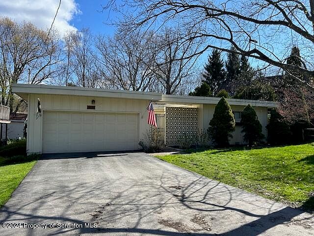 Uniquely designed California style 2 bedroom ranch on quiet dead-end street near Lake Scranton. This adorable home is nestled on a lot with a nice back yard as well as a lower patio, a 3/4 year resting porch, and sweet front area perfect for placing flowers and potted plants protected by a wrought iron gate and breezeblock. This ranch home possesses many interesting qualities such as a sunken living room, detailed wood-work, a wet bar in lower level with a fireplace, and entry hallway wall made with unique material. The kitchen has a large skylight which creates a ton of natural light. The main floor family room comes with oak parquet flooring with gas fireplace could also couple as an informal dining area if desired. The first bedroom is spacious and has an en-suite large bath with large soaking tub, shower, toilet and bidet. There is an additional main floor full bath outside the second bedroom. The lower level needs carpeting but is a great den area with bar and fireplace. The home needs a little 2024 boost with paint and minor upgrades but will make an incredible haven convenient to I81 and the downtown, but with the charm of feeling of being away from the hustle and bustle of city life.