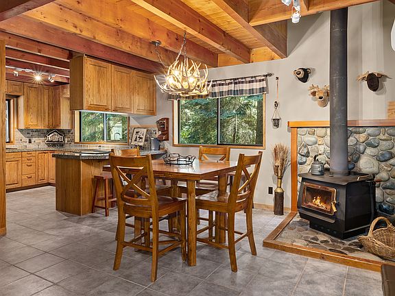 Private 2.35 wooded acres, fully paved with year around access. Classic 2 bedroom 2 bath cabin fully furnished & decorated with wood stove. Wall mounted heatpump unit provides efficient heating & airconditioning in addition to the forced air furnace. Hot tub, propane BBQ grill & fire pit under covered porch. The bunkhouse provides a 3rd bedroom and bath for family & friends. Large heated shop with 2 full size roll up doors, outbuiding storage, carports and RV parking. 12 month lease negotiable. Renter responsible for power & propane.