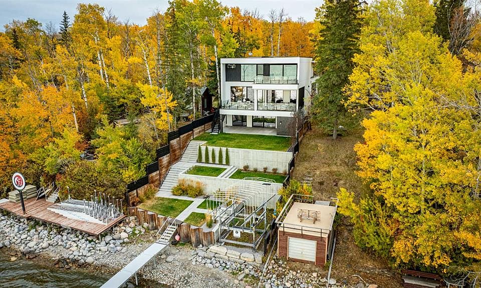 Welcome to The Cliffs — a breathtaking custom lakefront residence built by Square Structures, recipient of the Central Alberta Building Association’s Award of Excellence. This architectural masterpiece offers a seamless blend of luxury, function, and connection to nature, with panoramic south-facing lake views from every level. Designed with wall-to-wall, floor-to-ceiling triple-pane windows, the home is flooded with natural light and offers uninterrupted views of the water throughout. Step outside to enjoy 1,750 sq ft of outdoor decking, including a screened-in living space with gas fireplace, ceiling heaters and TV — the perfect extension of your indoor living. The striking exterior is finished with a premium combination of EIFS stucco, King Klinker brick, Cham Clad, and Lux Architectural panels, setting the tone for the elevated design found within. Enter through a 4’x8’ custom front door into an open-concept main floor featuring 8” wide-plank engineered white oak flooring, a spacious living area, and a fully custom kitchen complete with porcelain countertops, high-end appliances, a built-in ice maker, built-in coffee machine, induction cooktop, and a walk-through pantry housing a full-size fridge and freezer. The main floor also includes a 200 sq ft home office and seamless access to the outdoor living areas. The primary suite is a true retreat, featuring private lake-facing balcony access, a gas fireplace, and a spa-inspired ensuite with dual vanities, walk-through shower, and custom-tiled walls. Additional features include: personal GYM with wraparound balcony, WALK-OUT basement with lake views, family room, THEATRE room (100” screen & 5.1 surround sound) In-floor heating, ELECTRIC power blinds on every level, PROFESSIONALLY landscaped yard with tiered access to the water, underground irrigation, privacy fencing, and landscape lighting This is a rare opportunity to own a meticulously crafted luxury home with direct lake access and premium finishes throughout. The Cliffs is more than a home — it’s a lifestyle.