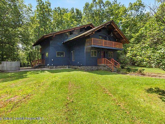 Highest and best offers due Sunday, 7/13 at 5PM. Tucked at the end of a quiet country road sits your opportunity to make a house your home. Renovate to live in, fix and flip, create your vision with this privately sited European-style chalet in a peaceful Catskills setting. With views of Overlook Mountain and the Wilderkill stream flowing nearby, it's a rare chance to reimagine a rustic retreat just minutes from Woodstock. Built in 1992, the original home features 4 bedrooms, 2 full baths, wide plank floors, and hand-hewn white oak beams that add warmth and character. After a pipe bursting incident and extensive repair, the home is ready for a new life for it's next steward. The layout invites creativity—whether you're envisioning a cozy full-time home, weekend getaway, or investment project. A cleared area awaits a future garage or studio. The maple-lined private road passes by a few other secluded properties until you reach yours, all on a private 7.56 acre parcel that balances nature and convenience. This is your canvas to create something truly special in the woods.