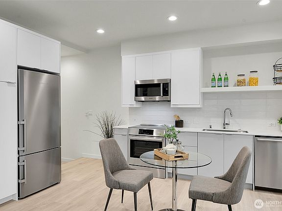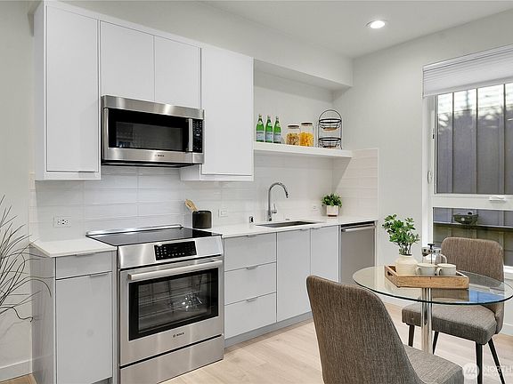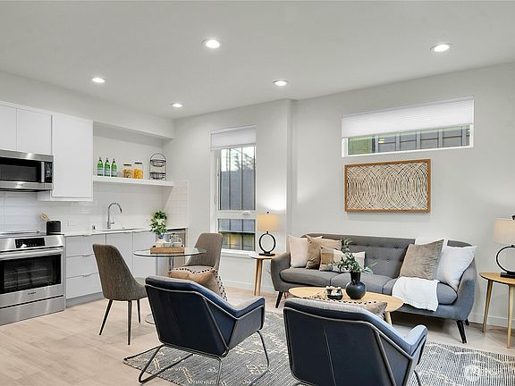 Stylish, sleek & sophisticated 2022 built townhome is nestled in quiet North Capitol Hill just 1.5 blocks to Volunteer Park! Light-filled 2 bed/1.75 bath corner home boasts oversized windows & an open concept floorplan on main lvl. Quietly located, yet easily walkable to be in the hub of cafes, shops & restaurants. Entertain on your spectacular rooftop deck w/gorgeous city & territorial views, complete w/natural gas stub-out for warm weather BBQ's. Beautiful kitchen w/stainless steel appliances, slab quartz countertops, induction range & modern cabinetry. Top floor primary suite w/tiled bath & walk-in closet. Separate utility room w/storage. Custom blinds provide privacy. Built Green 4-Star. Efficient heating/cooling systems. Welcome home!