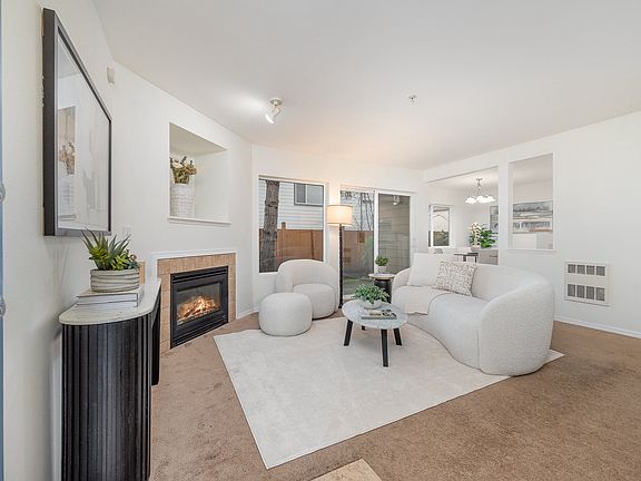 As you enter, you'll be greeted by a spacious and fully updated kitchen with plenty of cabinetry, sleek countertops, a breakfast bar, and modern appliances. The adjacent dining area flows into a cozy living room with a gas fireplace, perfect for relaxing and entertaining.