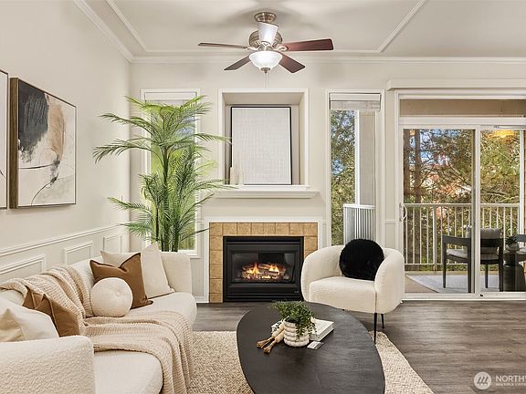 Welcome to your private retreat in the heart of Sammamish! This beautifully updated corner-unit condo blends timeless design with modern comfort—featuring rich flooring, elegant millwork, and an inviting gas fireplace. Natural light fills the open layout, with dining area flowing to a spacious balcony overlooking lush greenery. The kitchen offers ample cabinetry and bar seating for effortless entertaining. Enjoy resort-style living with a pool, gym, and clubhouse just steps away. Prime location minutes to shopping, parks, and top-rated schools—an ideal fusion of comfort, convenience, and style.