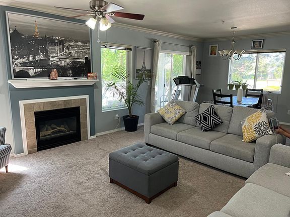 Comfortable Living: Wall-to-wall carpeting, a gas fireplace, and a large living room create a warm and inviting atmosphere.