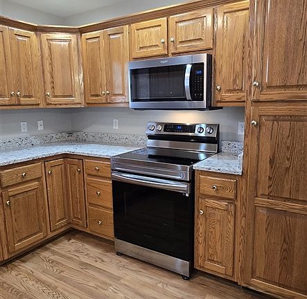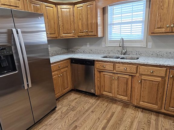 Beautiful home with New carpet, paint, refrigerator, microwave, tile shower and refinished hardwood floors. 4 bedrooms, 2 full baths with tile flooring. Large kitchen with eat in area and beautiful oak cabinets. This home is a split bedroom floor plan. NO PETS | 13 month lease required with $1,895.00 security deposit.