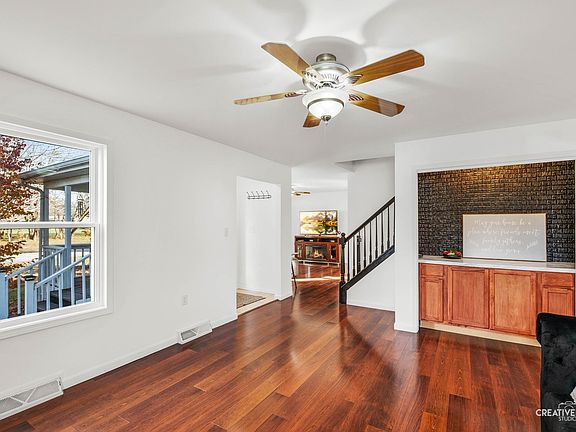 Cozy wood burning fireplaceEpoxy floorSmall nook with cabinetryWooded backdropFresh paintDouble lotCul de sac