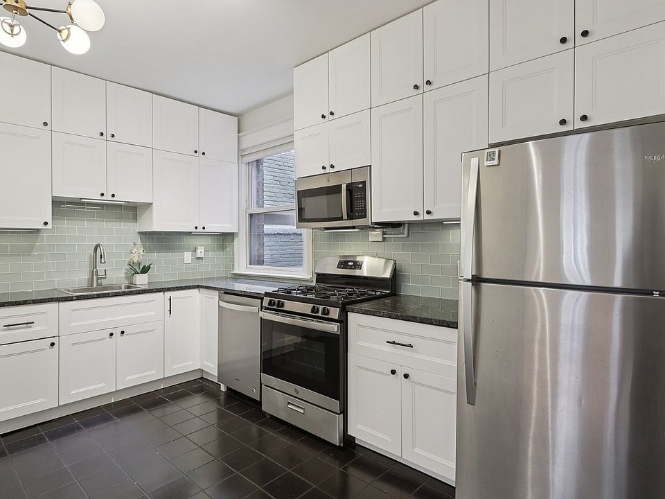 The kitchen features granite countertops, a gas range, dishwasher, microwave, garbage disposal, new fridge, stainless steel appliances, and a sleek glass tile backsplash.