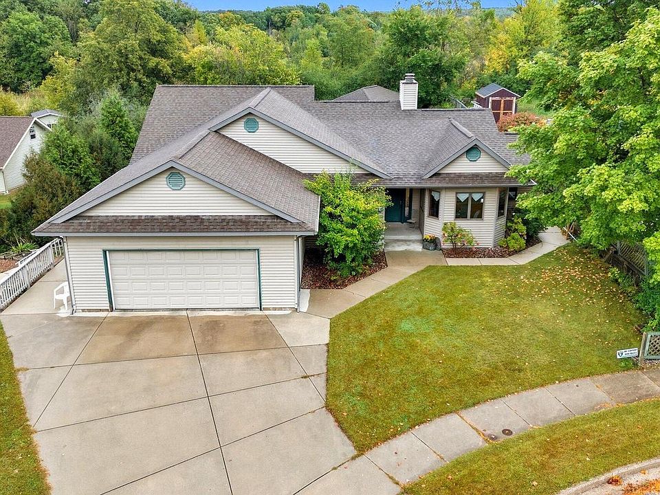 This CUSTOM built home offers OVER 2,700 sq ft! Step in to the sun drenched LR featuring skylights, a wall of patio doors, and a two-sided fireplace open to the FDR. KIT offers an island, eat-in area& BI desk. The spacious primary suite has vaulted ceilings, skylights, huge WIC, private screened porch, and private bath with jetted tub and shower. Two more spacious bedrooms, plus an updated full bath. First-floor laundry. The exposed lower level offers an ideal IN-LAW SUITE with 2nd FULL KIT, rec room, Murphy bed, home office,/flex space, full bath, and workshop! Newer Trex deck, private yard, and 2 level shed with upper ''she-shed'' space & LL for equipment storage. No detail was missed! All of this in end of cul-de-sac within walking distance to the Milwaukee River, parks and shopping.