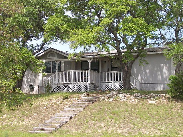 Manufactured home sitting up on it's own little hill with some views, greenhouse, storage, single car garage with a workshop (and garage / workshop has insulation and A/C). Most of the furniture & Appliances will stay. Open kitchen and family room, with an additional living room and dining room combo. So much space. Split plan. Huge walk in closets. Pass thru FP in Family room to Living room. Nice front deck with shade trees. Fenced yard. Ready to become your get away home. So close to Canyon Lake, Wimberley, and other popular areas. Will Rent for $800/mo + utilities.
