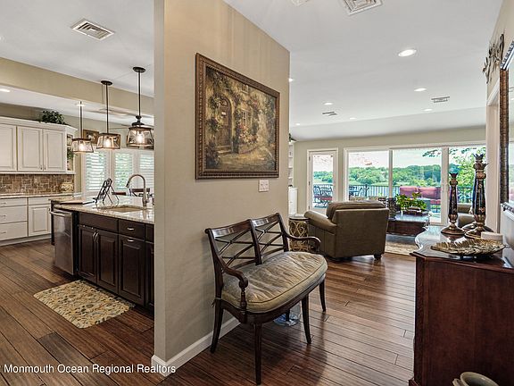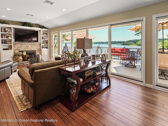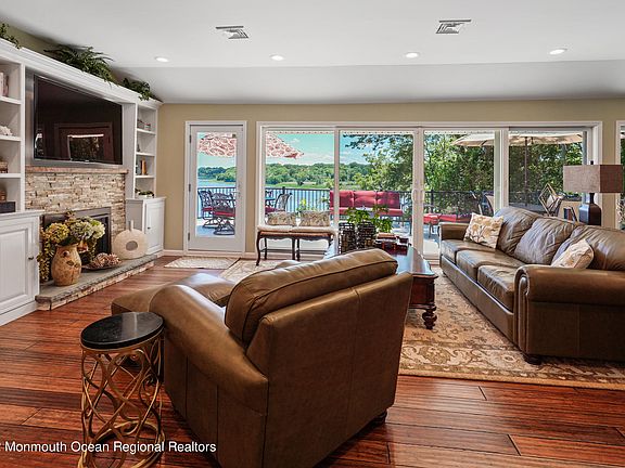 Magnificent Shark River waterfront home with unparalleled water views from every room. A rare find that offers nature, privacy and seclusion in a park-like setting. Watch the eagles land in your trees and nest across the river in the nature preserve. Updated, 2 story raised ranch, with an amazing floor-plan for entertainment, which flows from the front door to the kitchen to the great room onto the deck and down to the water. Lower level consists of 2 magnificent bedrooms with unobstructed views across the water. Primary bedroom features a marble front gas fireplace, walk-in closet, full bath and floor to ceiling views across the river. Access to a covered patio area under the fiberglass deck, ideal for a firepit or hot tub. Second bedroom also has full views of the river. House was completely remodeled in 2019. Kitchen has granite countertops, stainless steel appliances, wet bar and a wine cooler. Fabulous breakfast bar/ island with additional cabinetry ideal for entertaining. Great room has a gas fireplace and astounding views through floor to ceiling windows that span the entire width of the house. Doors leading to a fiberglass deck with aluminum railings. The deck allows for outdoor grilling, many happy hours and rest after a full day at the beach or on the water.