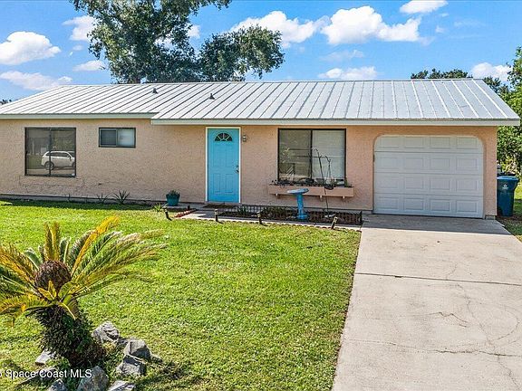Cozy and functional, this 2-bedroom, 1.5-bath home offers 888 sq. ft. of living space on a spacious 0.23-acre lot. Inside, you'll find tile flooring throughout, a bright family room, and a separate dining area. The kitchen features white cabinetry, matching appliances, and plenty of natural light. Fresh interior and exterior paint give the home a clean, inviting look, while the metal roof (installed in 2019) provides years of reliable protection. Step outside to a large backyard with endless possibilities—add a pool, patio, or garden. The single-car garage adds extra storage and convenience. Located near shopping, schools, and quick I-95 access, this move-in ready home blends simplicity, function, and lasting value.