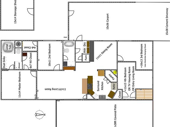 4BR (yes FOUR bedrooms), 2BA, 3-sided carport, large private covered patio,