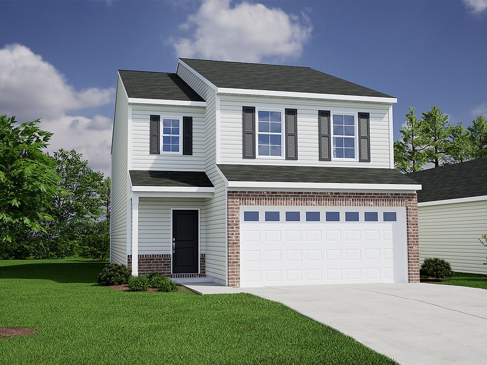 This Kershaw plan includes three bedrooms and two-and-one-half bathrooms. The kitchen includes stainless steel appliances with a gas stove, and granite counters with an island and overlooks the great room with a gas fireplace. The first floor also features a spacious flex space. Upstairs, you'll find the primary suite with a dual sink quartz vanity and roomy walk-in closet. A loft area is also located upstairs leading to the two spare bedrooms, each with walk-in closets. The home includes a covered back porch that overlooks a protected treeline.