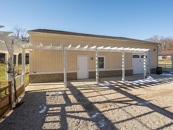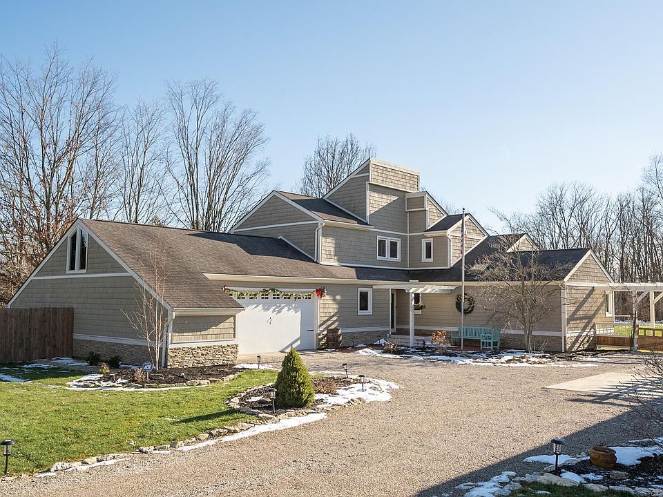 Space and privacy is what you'll experience on this 4.36 acre property which includes woods & large pond. Crisp white kitchen has upgraded light fixtures, shiplap walls, skylight, and open concept. Great room boasts built in bookshelf, & stone FP. In addition, on the first floor you'll find the owner's suite w/ private bath, laundry room & wash tub, spacious den with fantastic pond views, and an exercise/flex room. Second floor has two large bedrooms and a full bath. Exterior includes a stand alone fully finished, heated and cooled, w/ full bath, 350 sq ft finished office in the 1800sq ft multi-purpose building which has loads of potential! Boat/RV storage, or a car enthusiast's dream! 12 ft ceiling height & oversized door, outbuilding could easily be finished for additional living space.