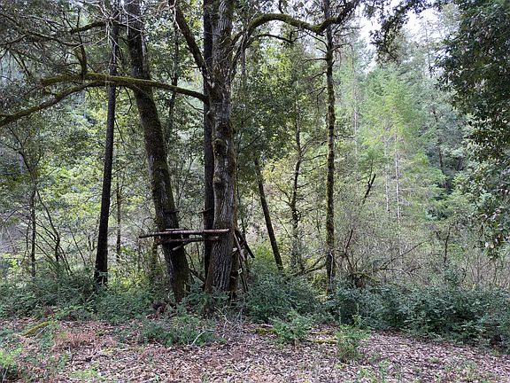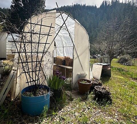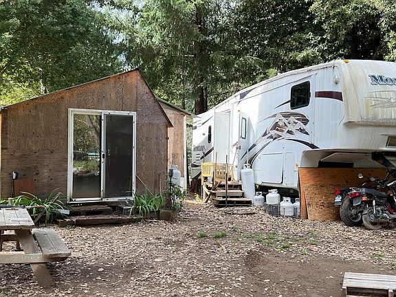Wild & scenic Northern California mountain area is home to this beautiful, mostly flat property bordering Red Cap Creek in Orleans. Bordered on 3 sides by USFS and near Spiritual Trail. Good sun exposure and rich soil offers great potential to live off the land with privacy. Fruit trees & fenced garden area. Small sleeping cabin and 2007 5th Wheel are included with sale. Currently off grid; owner uses generator for power. PG&E is possible with a building permit. Old home/manufactured on property probably a tear down, old septic in unknown condition; current owner uses composting toilet. Water provided from creek with a gas-powered pump, to tiered water tanks, then gravity fed to property. As-Is sale; motorcycles are not included in sale. Some equipment may be purchased separately.
