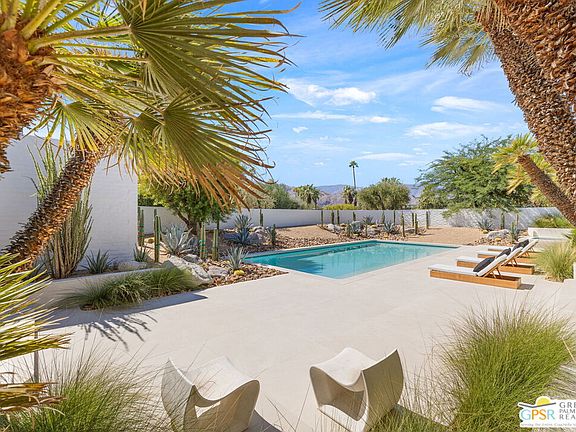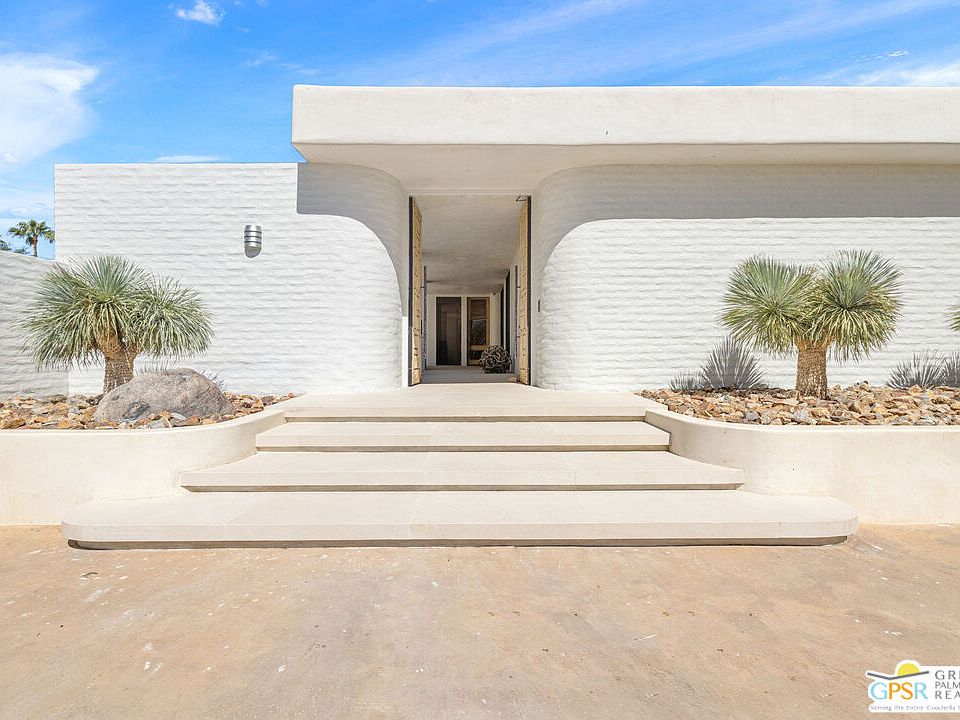 Dramatic contemporary at Tamarisk, Rancho Mirage. Designed by architects Holden & Johnson and reimagined by acclaimed designer Xorin Balbes, whose work Architectural Digest praised as "not just homes, but a whole philosophy for living." Set on an elevated corner lot with expansive, unobstructed South and West mountain views that deliver the ultimate wow factor, this residence embodies the essence of desert resort living. Terraced pool and spa areas are framed by covered outdoor lounges, dining terraces, and desert modern landscaping where sculpted boulders, native plantings, and dramatic lighting complement the architecture and heighten its connection to the surrounding mountains. Inside, soaring ceilings and fluid entertaining spaces are anchored by a signature sunken bar and formal dining room. The modernist chef's kitchen blends clean lines with glass-framed breakfast area and counter seating, featuring Sub-Zero refrigeration, Miele double ovens, Gaggenau dishwashers, and a built-in espresso station. Smooth plaster walls, fine stone surfaces, custom wood detailing, and new flooring add warmth and refinement throughout. Five ensuite bedrooms enjoy excellent separation, including a primary retreat with private gym or office. Nearly 5,200 square feet of sophisticated design with owned solar, Lutron lighting, full home automation, and a two-car garage plus golf cart parking. A timeless architectural compound adjacent to Tamarisk Country Club.
