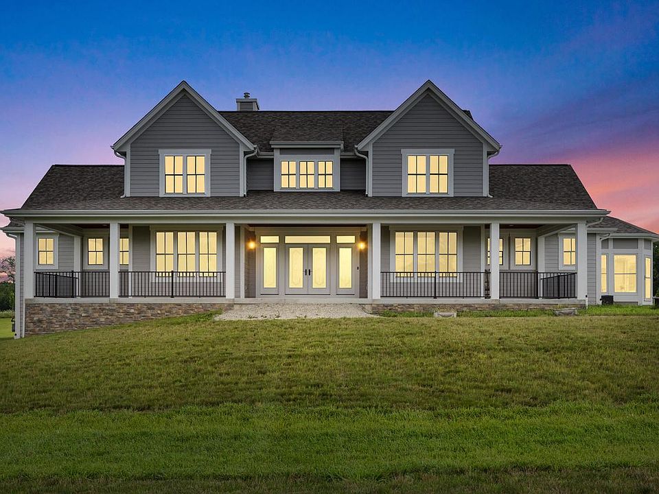 Gorgeous 2022 quality built custom home loaded with amenities and situated on a picturesque 5.646-acre lot. Step inside the oversized foyer that leads to a spacious open concept GRT RM with wood burning FP, dinette and gorgeous KIT w/custom cabinetry, farm sink, large island, quartz counters and walk in pantry. Main floor master BR suite has spa like BA w/oversized dual head tiled shower and huge WIC. The main floor boasts a large second BR, spacious office, well-appointed laundry room and a 3-season room. Second floor boasts 2 large BR's, w/built-ins and a Jack and Jill BA. Lower level is ready for expansion w/egress windows, plumbed for BA and bar. Auto enthusiasts dream 4 car+ GA, 2 electric charge stations, shower/dog wash rm, and stairs to basement. Huge wrap around porch and deck.