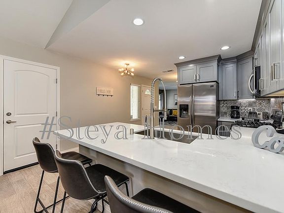 - contemporary over-sized gourmet kitchen, fully stocked and set-up with stainless steel appliances, quartz counter tops, custom tile backsplash and a dining area.