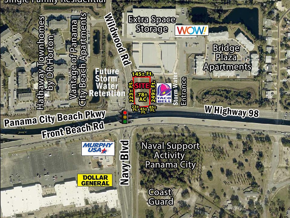 Super prime location in the center of the activity on the east end of Panama City Beach, across Wildwood Road from 156± unit Hathaway Townhomes, 288± unit Vantage of Panama City Beach Apartment Homes, 113± Lot Emerald Cove Single Family Residential Development, as well as, other Condominium and Residential Developments. Very near this location is the recently completed 220± Acre Panama City Beach World Class Sports Park with 12-15 Multi-Purpose Fields for hosting Baseball, Softball, Soccer, Flag Football, Lacrosse,