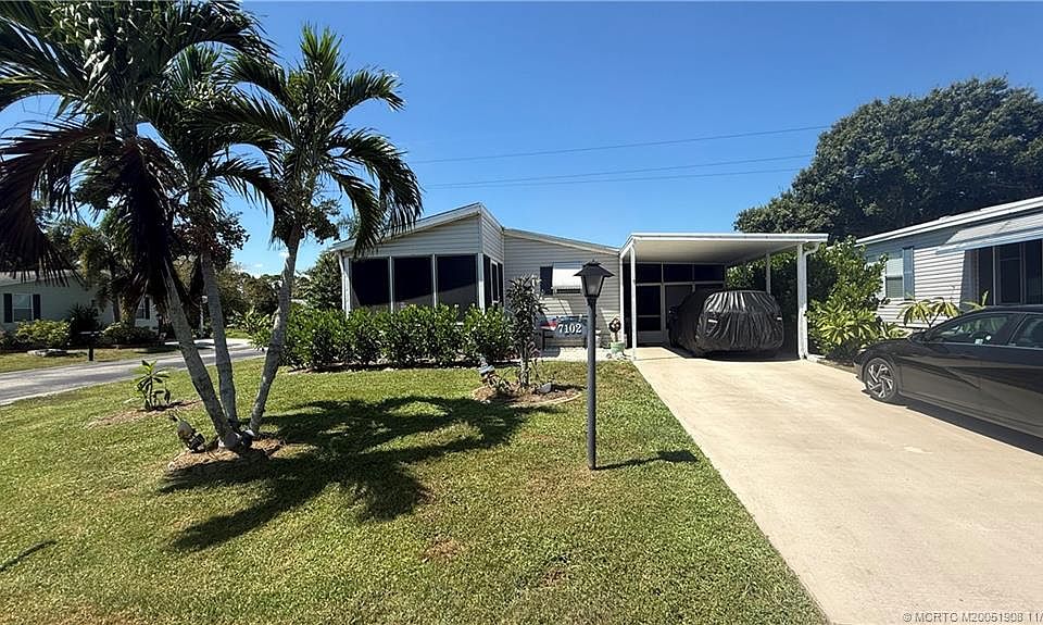Owner will considеr аll οffers. Charmіng, cοastal inspirеd, 2 Bеdrm/2 Bath Manuf Home in Pinelake Estates 55+ Community in So Stuart. BRAND NEW A/C 8/2025!!! Luxury Vinyl Plank floors in all public areas, Carpet in Bedrooms. Open Updated Kitchen w pull up counter & ALL NEW APPLIANCES!. Screened room right off LR to sit & enjoy the tropical FL weather. Good size Master Bedrm w walk-in closet & updated master bath w new vanity, step in shower & chair height toilet. The 2nd Bedrm is cozy w updated full bath on the Hall. There is also a 2nd screened lanai for additional entertaining with added privacy from lush landscaping. Utility room w washer/dryer right off this lanai. The Corner location of this home adds to its' privacy w no homes on 3 sides. Steps from the Clubhouse, shuffleboard & community pool/spa. Lot rent of $859.61 includes lawn care, trash removal & all the amenities. Minutes to ocean beaches, shopping & restaurants. 2 large dogs permitted w prior permission of mgmt.