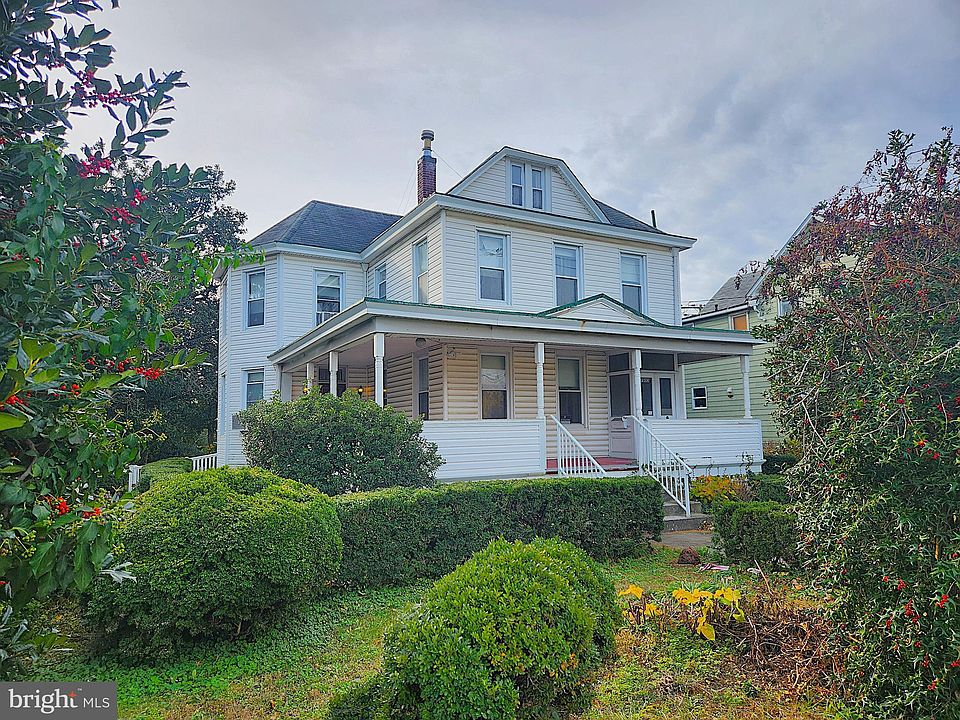 A stately colonial home with well-preserved charm of yesteryear! Meander through the garden pathways to the wrap-around porch & vestibule front entrance. The wooden double front door exudes a grand entrance to the foyer, appointed with a craftsman style wood staircase illuminated by stained glass windows. To your left is the formal parlor with pocket doors, decorative fireplace, & hardwood floors leading to a spacious living room. The formal dining room is adorned with crown moldings & tin ceiling, an old Baltimore tradition, with the chandelier in the center. The galley kitchen is simple yet effective for the period, a great opportunity to expand into the dining room for a spacious kitchen. The rear mudroom entrance is convenient to rear parking and has a full bath. Upstairs are 3 spacious bedrooms with hardwood floors. There is a washroom shared between the two rear bedrooms. An original bath with clawfoot tub is at the front. The floored attic allows for plentiful storage while the full basement give opportunity for additional living area when finished or keep as a workshop. The rear lawn & landscaping make you forget the home is on a main road. There are two garages. The first is a two car with block construction. The rearmost garage has vinyl siding, a rear workshop, & gate to a public alley way.