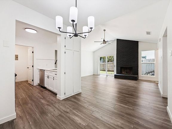 Inside, you'll find stylish LVP flooring throughout, modern finishes, and a spacious living room complete with a cozy fireplace. The kitchen is equipped with stainless steel appliances, sleek hardware, and plenty of storage. Three generously sized bedrooms provide ample space, while the primary suite boasts an ensuite bath with double vanity sinks.