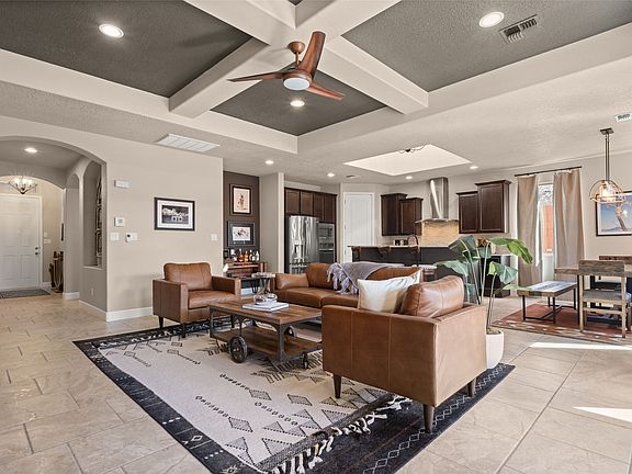 CORNER-LOT IN HIGHLY DESIRABLE LOMAS ENCANTADAS - This stunning corner-lot property in the highly sought after Lomas Encantadas Community offers the perfect blend of both comfort and elegance with its chic architectural details throughout. Meticulously maintained by its owner, this 3-bedroom, 3-bathroom single-story residence with no interior steps also includes a flex room that can serve as a supplemental office or media room. Enjoy cooking in the beautifully appointed chef's kitchen, which features stainless steel appliances, granite counter tops, and a sizable pantry. The spacious living room is bathed in natural light and boasts a coffered, two-tone ceiling which seamlessly flows into the kitchen and dining areas and opens onto a covered patio. The large three-panel door leading to the rear patio provides plenty of natural light and the perfect vantage point for enjoying those spectacular evening sunsets! The large primary suite offers ample space for a supplemental sitting area, while also accommodating a king-size bed. Two additional bedrooms are also generously sized and share a Jack-and-Jill Full bathroom. The tandem garage provides extra room for a significant amount of storage and either a workshop or hobby space. With its spectacular views of the Sandia Mountains at the front of the property and sunset views available via the rear patio, the outdoor spaces are truly inviting! This lovely home is conveniently located just minutes from schools, shopping, restaurants, and a dog park. Don't miss out on this exciting opportunity to own this spectacular home in Lomas Encantadas - schedule your showing today!