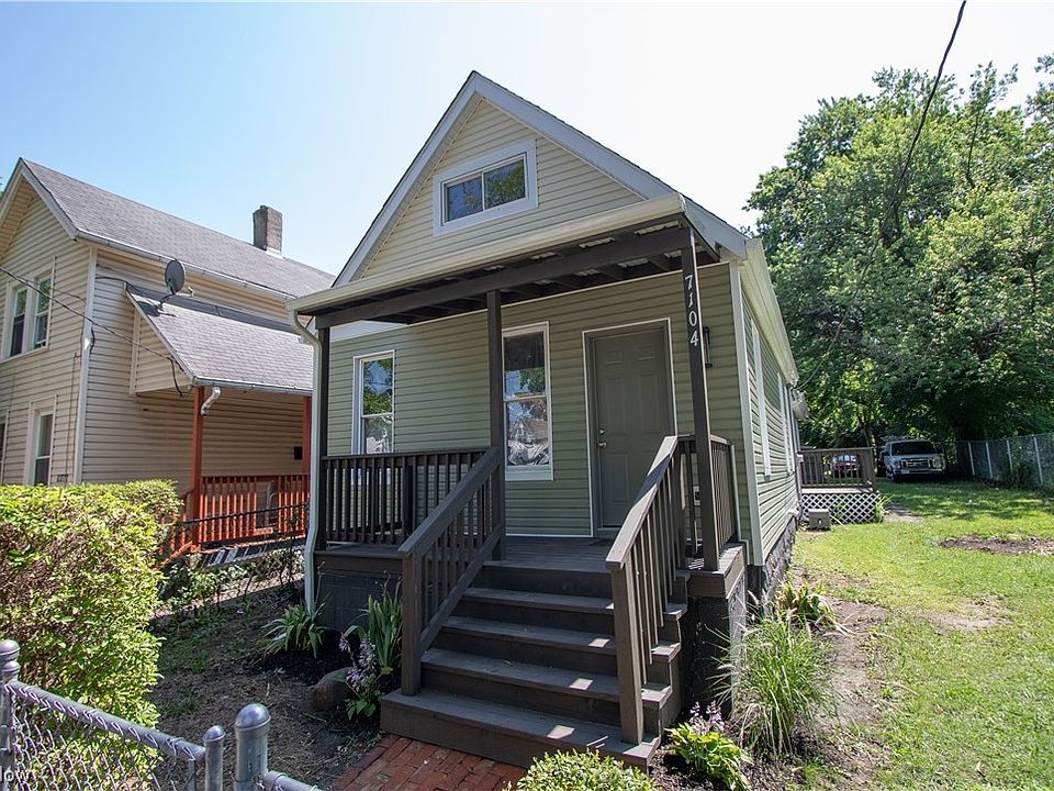 Charming Cape Cod with inviting front porch. The main floor has natural lighting, a full bathroom, two bedrooms, and a beautifully remodeled kitchen with all new appliances. The second floor features a third bedroom with a half bathroom. Easy to maintain yard, fully fenced backyard with plenty of shade. Located minutes from Opportunity Corridor and on a street with a lot of newer homes. All new in 2022: roof, electric, plumbing, paint, interior and exterior doors, bathrooms, tankless hwt, furnace, AC, siding, and all the kitchen appliances.