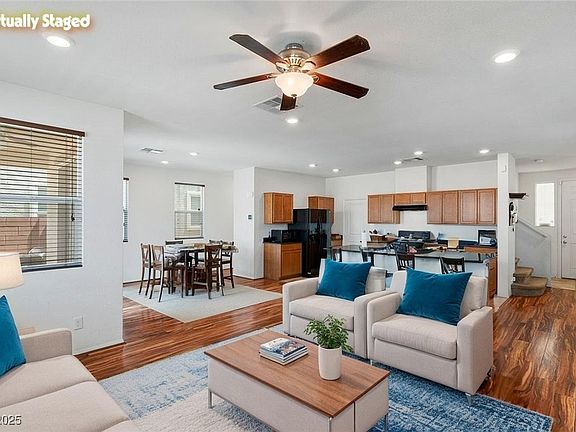 Welcome to this Fantastic Mountains Edge Home offering over 2,200 sqft of living space. This beautifully designed 4-bedroom, 2.5-bath features an open floorplan filled with natural light from the many windows. The spacious kitchen is perfect for entertaining, complete with a huge island, granite countertops, walk-in pantry, and plenty of storage. Upstairs, you’ll find all 4 bedrooms including a generously sized primary suite with a large walk-in closet, dual vanities, separate tub, and shower. The upstairs also includes a convenient laundry room. Tankless Water Heater as well as a Soft Water System. Extended paver patio, side walkway, desert landscaping, and artificial turf. Located within a gated community offering resort-style amenities including a pool, spa, fitness center, and playground. All of this in the fast-growing Mountains Edge Master Plan, known for its parks, trails, and nearby shopping. This home truly combines comfort, convenience, and community—don’t miss it!