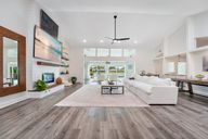 Fireplace with shiplap wallRenovated kitchenOutdoor kitchenNew saltwater poolOversized garageOpen layoutLakefront home