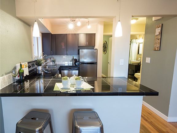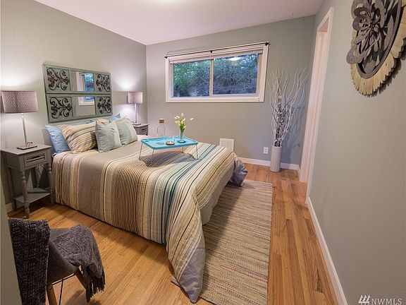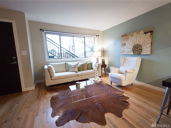 Mid-century boutique building located next to grocery, restaurants, coffee, pubs and an express bus to downtown. Premier private end unit w/ large bedroom, lots of storage & in-suite W/D. Open living room & eating bar kitchen is perfect for entertaining. Completely renovated w/ new kitchen & bath, granite, SS appliances & real wood floors. Great natural light and views through oversized picture window w/western exposure & view to the sound. Large basement storage & parking space included. Hurry!