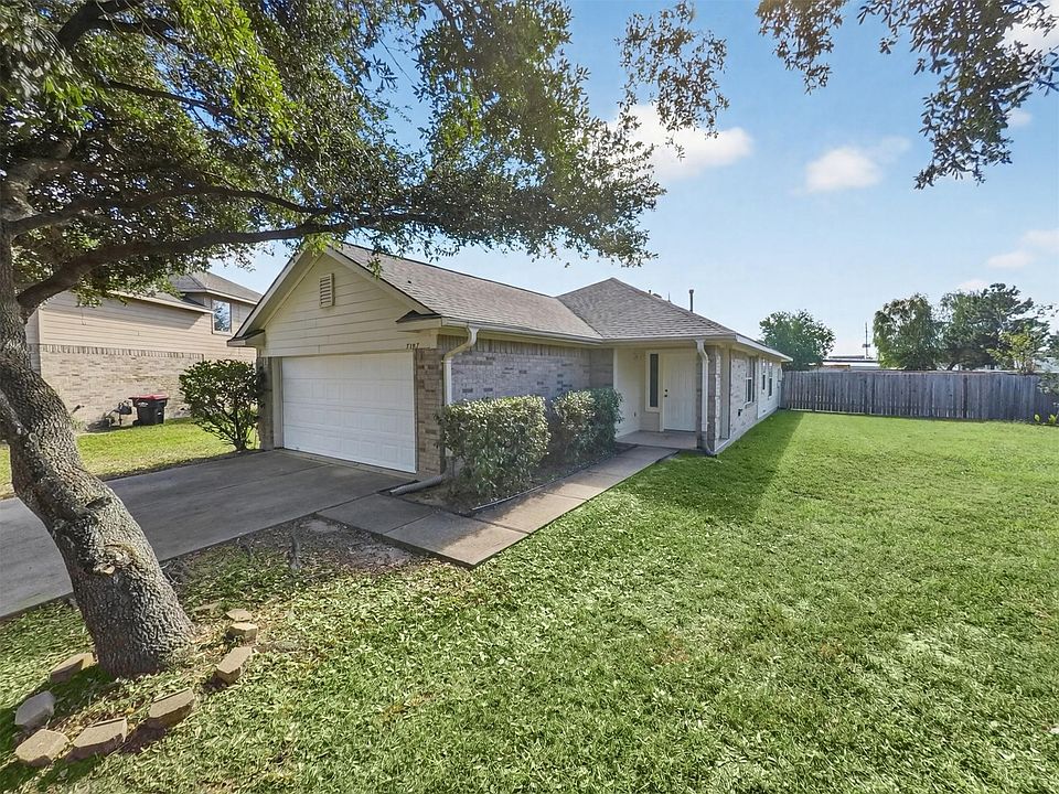This single-story home sits at the end of a quiet cul-de-sac and has a comfortable, welcoming feel. The quarter-acre lot gives you one of the biggest yards in the neighborhood, with extra room between homes and plenty of space for gardening, outdoor gatherings, or a future pool. Inside, the open layout makes daily life easy, with the kitchen, dining, and family room all flowing together for cooking, chatting, and relaxing. The front living room is a great bonus space perfect for a play area, home office, or cozy hangout spot. The primary bedroom is tucked toward the back with a walk-in closet and a tub and shower combo, while two additional bedrooms share a full hall bath. Tile floors throughout keep maintenance simple and fresh. The laundry room sits just off the garage for everyday convenience. Close to grocery stores and shopping, zoned to CFISD schools, and not in a flood zone, this home is ready for someone to make it their own. Come take a look!
