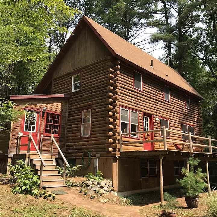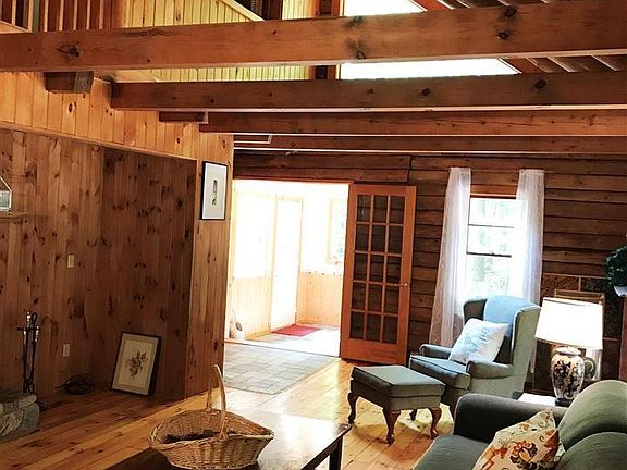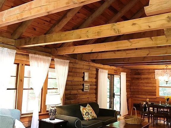 A cozy log cabin built in 1988 on 3.8 wooded acres, situated on a sun filled spot. Beautiful screened in porch overlooking the woods. Wood burning fireplace, vaulted ceilings, walkout basement ready to be finished. Loads of built ins, third floor bonus room.