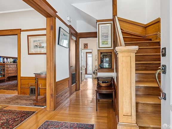 Spacious and bright Edwardian Mediterranean-style home in the heart of SF with classic wood-paneled foyer, living room, and dining room, contemporary kitchen, light-filled sunroom with deck overlooking the backyard, 3BR, 1.5BA, large garage, and bonus outdoor parking. Charming period details feature warm-toned, original oak hardwood floors, stairway, and paneling, bay window, brick fireplace, and elegant crown molding. Modern updates include recessed lighting, stylish deck, and tastefully renovated kitchen with stainless steel appliances complimented by custom cabinetry. Ground level hosts a one-car garage with abundant storage, laundry, utility sink, and access to the serene backyard centered on an elevated deck surrounded by mature foliage. Located on an iconic, tree-lined street, steps away from the splendor of GG Park's lush landscapes and cultural gems, multiple grocery stores, and abundant shopping and dining on Clement and Balboa, plus easy access to transportation.