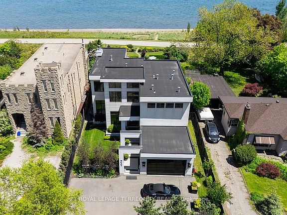 A rare offering on the shores of Lake Ontario, 711 Beach Blvd is a striking, custom-built residence completed in 2020, offering over 6,700 sq ft of total living space across three levels. Situated directly on the Waterfront Trail- 10 km of lakefront maintained by the City of Hamilton- this property boasts panoramic water views, total privacy, and direct access to the beach. With a 56' frontage that widens to 72' along the lakeside, and a professionally landscaped lot with multiple outdoor terraces, this is coastal living at its most refined. The home is a masterclass in design and craftsmanship, with 10' ceilings, Architectural Series Pella windows & doors, four Duradeck-covered terraces & an elegant stucco façade. Inside, high-end finishes abound: from custom millwork & Emtek marble hardware to Visual Comfort chandeliers, Swarovski accents & hand-cut marble inlays. The main floor is anchored by a dramatic two-storey foyer and a showstopping kitchen with commercial-grade appliances, grand Caesarstone island, built-in desk/office area & a bespoke bar & coffee room. The upper level features three bedrooms, each with an ensuite bath, including a luxurious primary retreat with a double-sided fireplace, lake views, and a spa-style bath with a huge gold soaker tub & an incredible double vanity. The lower level includes two additional bedrooms/offices, a large recreation/media room, a gym area & abundant storage. With a Jacuzzi swim spa, double garage with lift potential & outdoor parking for 5, this is a one-of-a-kind beachside sanctuary designed for elevated everyday living.