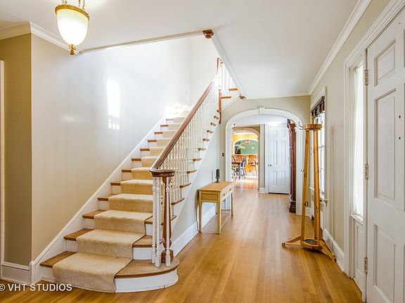 A classic brick Colonial nestled on 4 gorgeous wooded acres.Three en-suite bedrooms grace the original home.The new kitchen (2014) with a huge Cambria island, cherry wood cabinets, stainless appliances, and a "pass-through"to the dining room; a living room with fireplace, three walls of windows and just refinished 1/4-sawn hardwood floors; a 4-season sun room, and "locker room" complete the first floor.The English basement has a 2nd fireplace in the tongue-and-groove paneled family room with hardwood floors, countless built-in cabinets, huge laundry room, workroom, storage room, and full bath. But wait! There's more. A new garage expansion (2011) added in-floor heating, 2 over-sized stalls and center area, and a 30 x 30 roughed out space above with vaulted ceiling. AND there are two more bedrooms and full bath over the original garages perfect for guests, nannies, in-laws. Country living, yet convenient to the downtown area, library, rec center, and minutes to I-90!