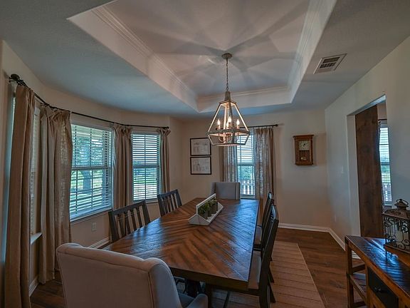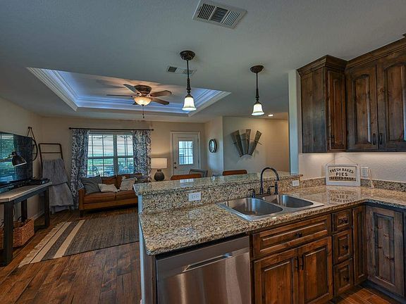Amazing Hill Country views from this stunning 3 bedroom, 2 bathroom home constructed in 2017! Located on over two-thirds of an acre, this is one of the best views in the City of Llano. As you walk into the home, you are greeted with wood-look tile flooring throughout with wonderful views from almost every room. A large dining room with French doors has plenty of space to host a dinner party or would make a great home office space. The kitchen boasts custom cabinetry, granite counter tops, undercabinet lighting and is open to the living room. The master suite is stunning with tray ceilings, a beautiful walk in-shower, soaking tub, and massive walk-in closet. Two nice sized guest bedrooms share a Jack-And-Jill bathroom that is accessible from the hallway. The garage provides plenty of room for your vehicles and additional storage with a ton of additional storage available in the attic. You will have low utility bills due to the home's great energy efficiency and spray foam insulation. New roof was installed in 2024 and outdoor storage shed was recently added. Enjoy the panoramic Hill Country views from the covered front and back porches and recently completed deck. There is plenty of room for a pool or additional storage building. Do not miss your chance to own this piece of Hill Country Paradise!