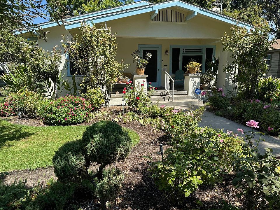 Quaint old world Bungalow style home lovingly restored with all the charm of yesteryear. Prestigious location situated on tree lined Weldon Ave, between Fresno High and Fresno City College. Spacious front and side porches. Recently painted exterior. Finished hardwood floors throughout much of the home. Picture molding. Family Room with fireplace, and sliding glass pane doors can divide from the Formal Dining Room. Dining room has built in china buffet. Large hall Bathroom features tub/shower combo, plus separate stall shower, pedestal sink. Three bedrooms, all with ceiling fans and hardwood floors. Kitchen with small breakfast nook and builtin buffet. Free standing gas range/oven & dishwasher. Inside utility room, with door w/doggie door to rear yard. Small basement for HVAC etc. Fully landscaped front and rear yards with many flowering plants creating springtime splendor. Rear yard has stone paver walkways meandering thru yard with a rock waterfall, shady areas for chairs or picnic table. Room for a small garden. Oversized single car garage with extra room for storage or a workshop. Roof approx 2 years old on house, 8 years on garage. Well kept and selling AS-IS.Last 6 photos were taken during the springtime flower blooms