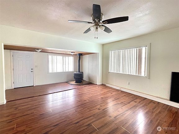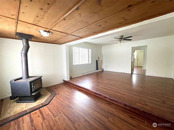 Omak - DOUBLE LOT - 2+ bedroom / 1 bath home with attached covered deck. Entryway opens into extensive living room with wood stove and ceiling fan. Bonus room may be used as den/office. Kitchen with all appliances stay. Laundry room off kitchen has rear doorway leading out into generous partially fenced back yard. City utilities. Located close to all downtown amenities. $174,900. H-3111/MLS-2008657