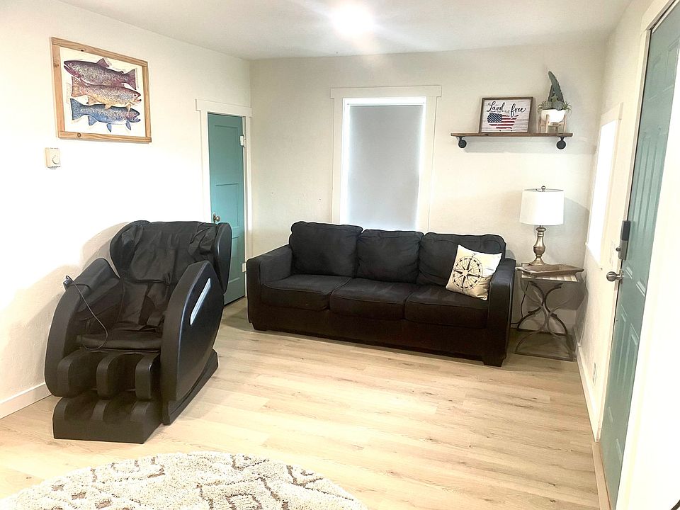 Step inside and be greeted by modern luxury features, including durable LVP flooring and stunning quartz countertops throughout. The spacious living room is perfect for relaxation and entertainment, boasting a 65" smart TV for your movie nights. Don't forget the top of the line massage chair-perfect for relaxing after a long day! Each bedroom is designed for comfort, featuring cozy queen beds outfitted with all linens, comforters, pillows, and throw blankets everything you need for a restful night's sleep.