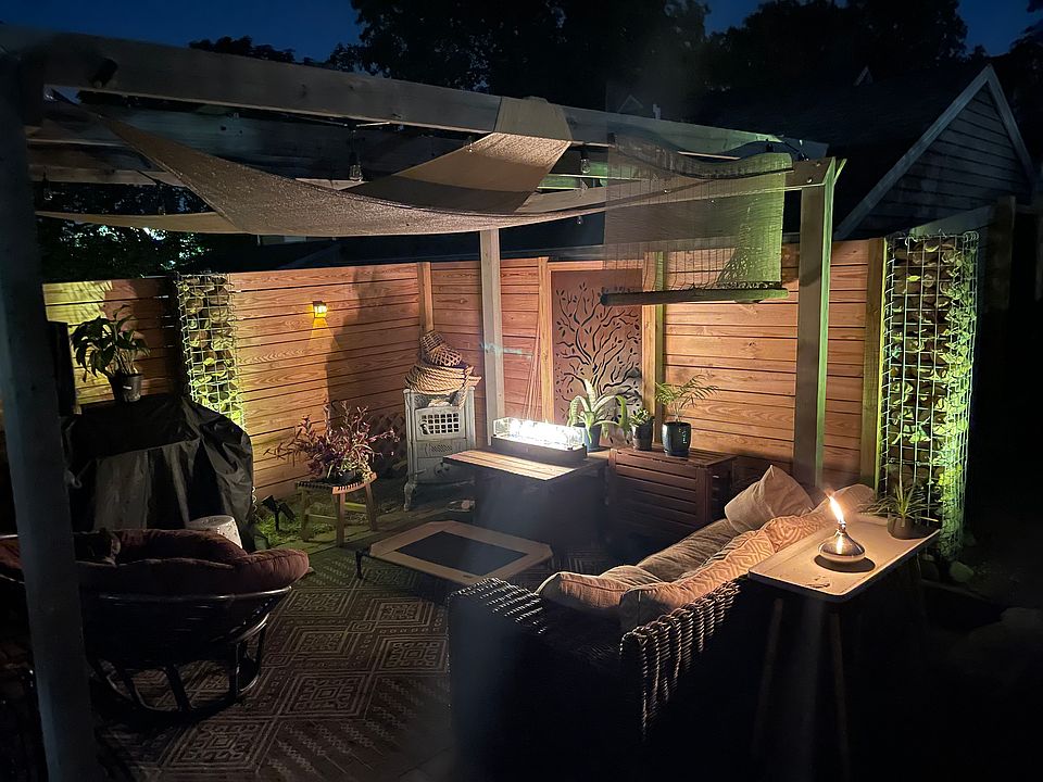 Backyard updated with separate sitting/lounging space and green space. Front porch hammock.