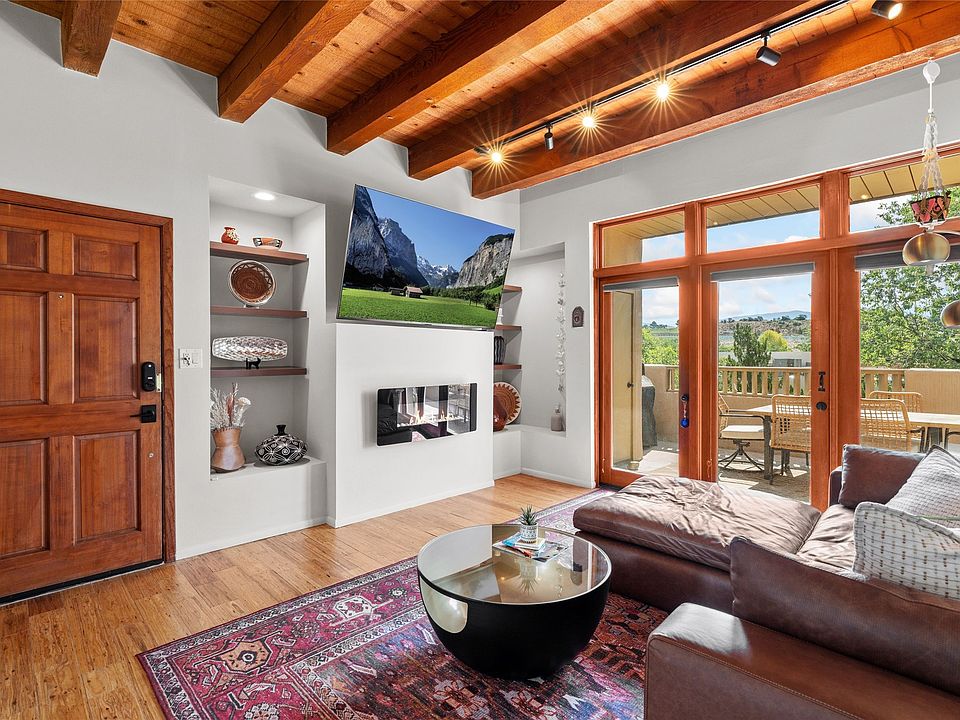 Charming 1-bedroom, 1-bath condo located in the convenient Viento del Norte Condominiums. This end unit offers a unique advantage with no neighbors on the north side, allowing for an abundance of natural light to fill your living space through extra windows. Bright and inviting interior flows seamlessly into a spacious balcony, nearly doubling your entertaining area. Imagine hosting friends and family as you enjoy the beautiful Santa Fe weather! The condo features elegant wood and tile floors, complemented by square-cut beamed ceilings that add a touch of rustic charm. The wood-framed glass doors enhance the open feel and bring the outdoors in. Create a relaxing atmosphere in the evenings by the stylish fireplace with glowing flames by touch of a button. The galley kitchen showcases white cabinets paired with butcher block countertops. A stacked washer/dryer is in the large pantry/storage area. This condo includes both assigned parking and a one-car garage downstairs, offering added value and ease. Just minutes from the Devargas Center and downtown Santa Fe. An ideal condo for a seasonal foothold in Santa Fe, a profitable rental property, or a carefree home in a prime part of Santa Fe.