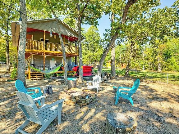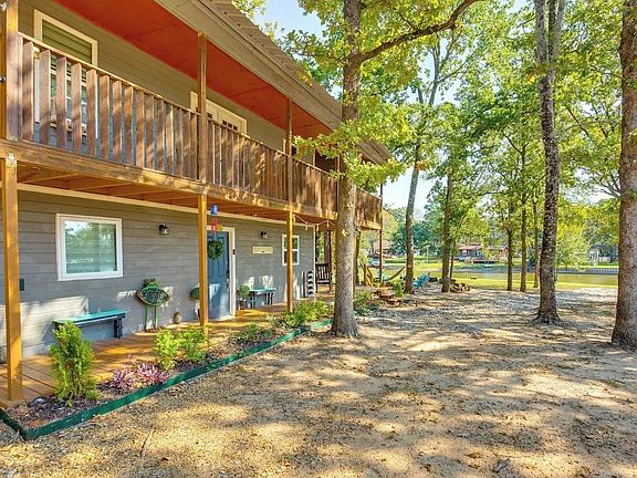 Whimsical treehouse feel to this two story lake cabin! The home has main living, kitchen and bath on main floor with a second large game room space, two bedrooms upstairs. The large upstairs living space opens out onto wrap around decking where you truly have a birds eye view out across the cove! With two decks, one up and one down, you have ample outdoor living and entertaining space! Gather around the firepit, swapping fish stories or enjoy long summer days in the shade of the towering trees. Located on a deep water, protected cove, this is ideal for little swimmers, paddle boats, kayaks and floating fun in a no wake area! This fully fenced lake escape is located very convenient to private neighborhood boat launch for easy access to boating and jet ski fun! This home has been used as a popular vacation rental and has perfect shoreline for easy launch of kayaks and paddle boards! Available fully furnished for a turn key and summer ready getaway! This charming lake subdivision has many amenities including not only a great boat launch but community pool and playground only a golf cart ride to meeting more neighbors and sharing in the fun!