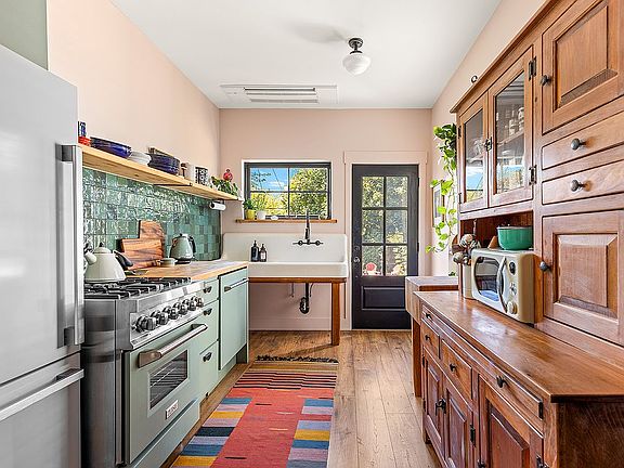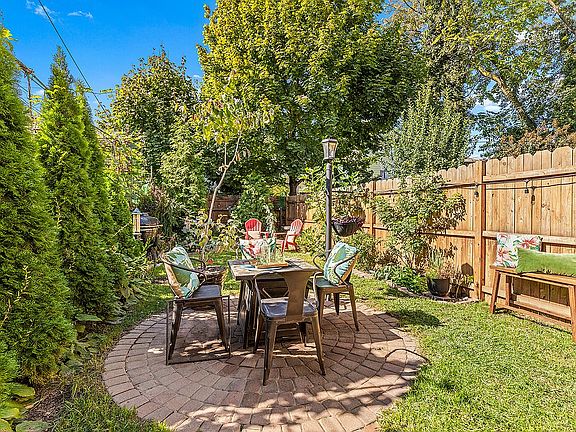 The renovated eat-in kitchen is both stylish and functional, featuring updated appliances, butcher block countertops, and a farmhouse sink. A French door opens to a serene, country-sized backyard and garden - your own private retreat, perfect for summer barbecues or relaxing after a long day.