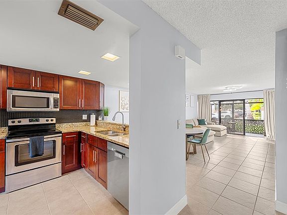 Granite countertopsCorner unitLarge screened patioSleek updated bathroomsStainless appliancesKitchen has wood cabinets
